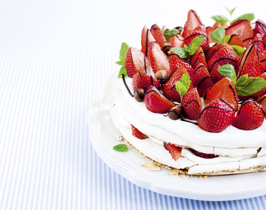 4. Aseta täytetyn pohjan päälle toinen marenkipohja sekä loput täytteestä. Koristele mansikoilla ja hasselpähkinöillä. Ripottele kevyesti tomusokeria mansikoille ja valuta päälle sulatettu suklaa.