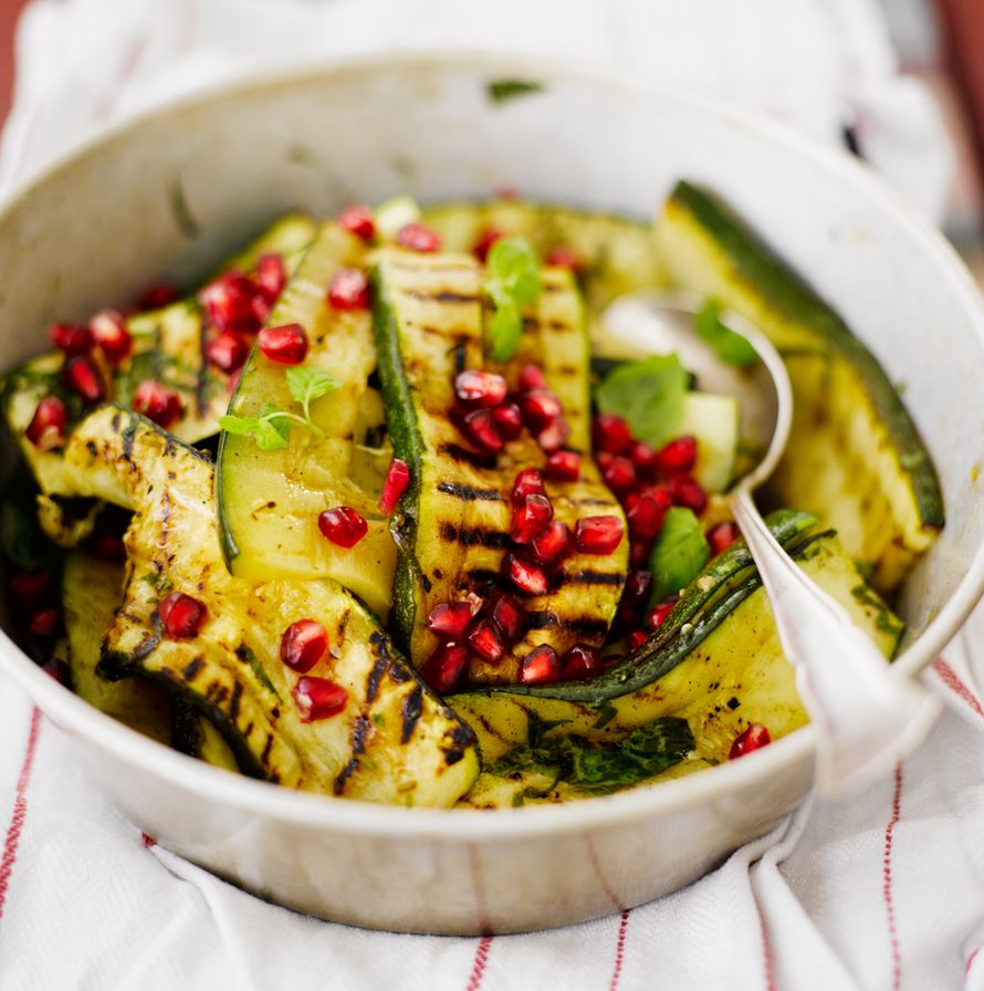 3. Lisää keräkurpitsoille minttua, etikkaa, öljyä ja mustapippuria. Anna maustua hetki huoneenlämmössä. Voit viimeistellä kesäkurpitsat granaattiomenan siemenillä.