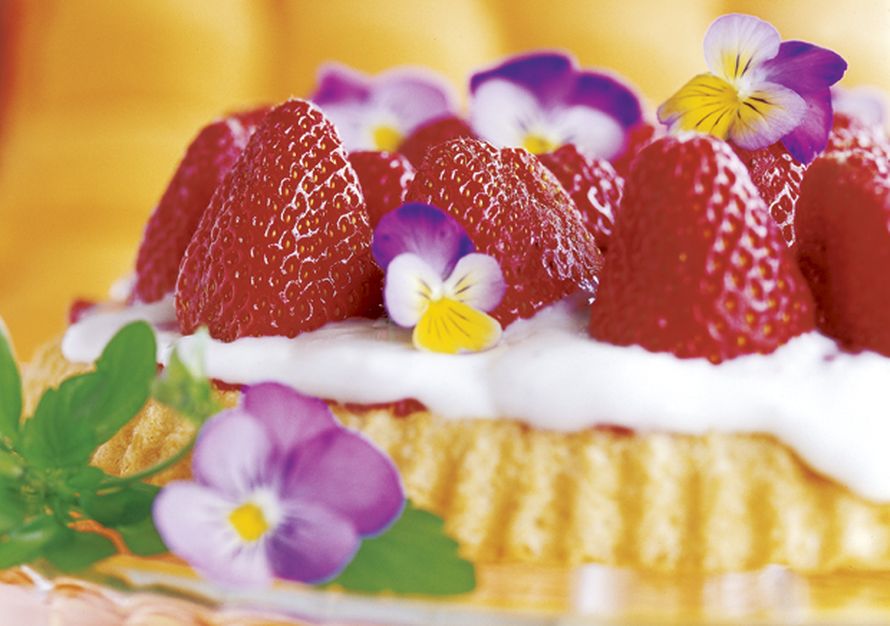• Koristele kakku syötävillä kukilla, joita ovat esimerkiksi orvokki, krassi, ruiskaunokki, kehäkukka ja ruusun terälehdet. Yrteistä kukintoineen koristeeksi sopivat sitruunamelissa ja minttu.