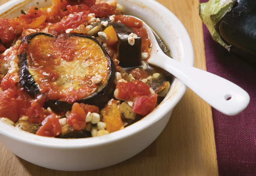3. Levitä syvän uunivuoan pohjalle tomaattimurskaa, jonka päälle kerroksittain munakoisot, sipuli-sieniseosta ja juustoa. Kerrosta vuoka siten, että tomaatti murskaa riittää myös päälle.