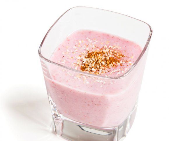 Mittaa piimä ja hieman sulaneet pakastemansikat korkeareunaiseen kulhoon. Sekoita sauvasekoittimella tasaiseksi. Lisää kauraleseet, fruktoosi, kardemumma ja kaneli.