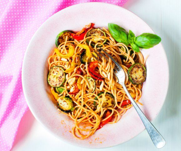 6. Sekoita valutettuun pastaan tomaattikastike ja kasvikset ja koristele pinjansiemenillä.