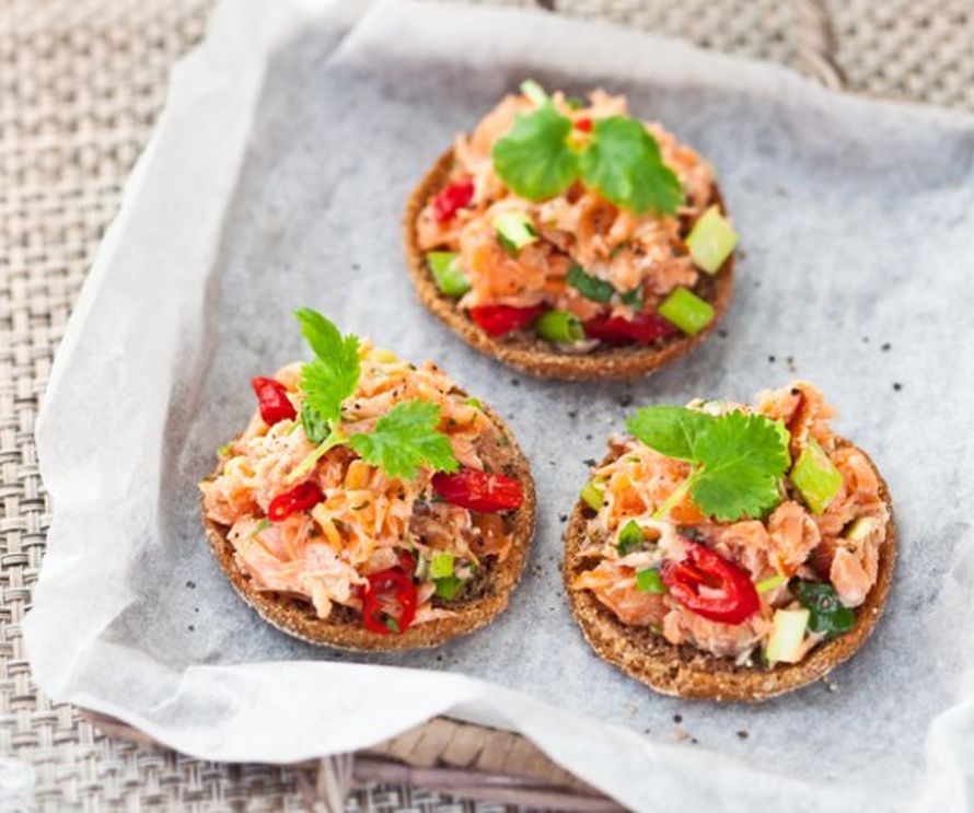 2. Lisää mehu ja öljy. Anna maustua hetken jääkaapissa. Tarjoa ruisnappien päälle alkupalana.