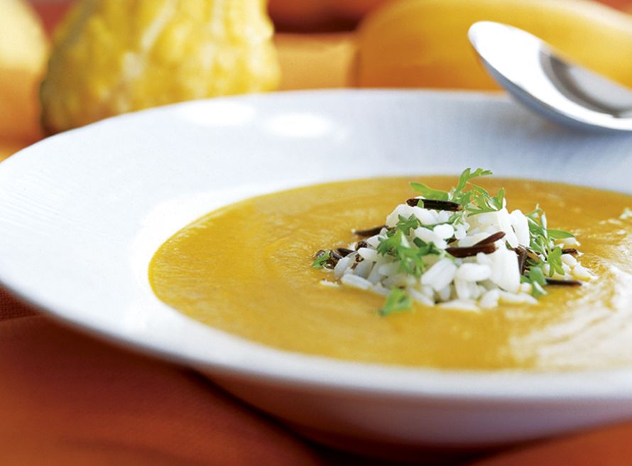 Kurpitsakeitossa on mausteina inkivääriä, kanelia, chiliä ja muskottipähkinää.