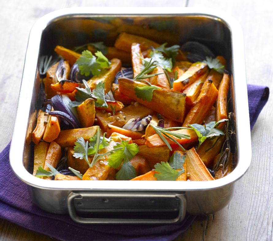 1. Lämmitä uuni 225 asteeseen. Kuori bataatit ja porkkanat. Irrota kurpitsasta kuori. Viipaloi porkkanat ja leikkaa bataatit ja kurpitsa hieman porkkanapaloja pienemmiksi viipaleiksi. Kuori ja lohko punasipuli. Laita kaikki leivinpaperilla päällystetylle uunipellille.