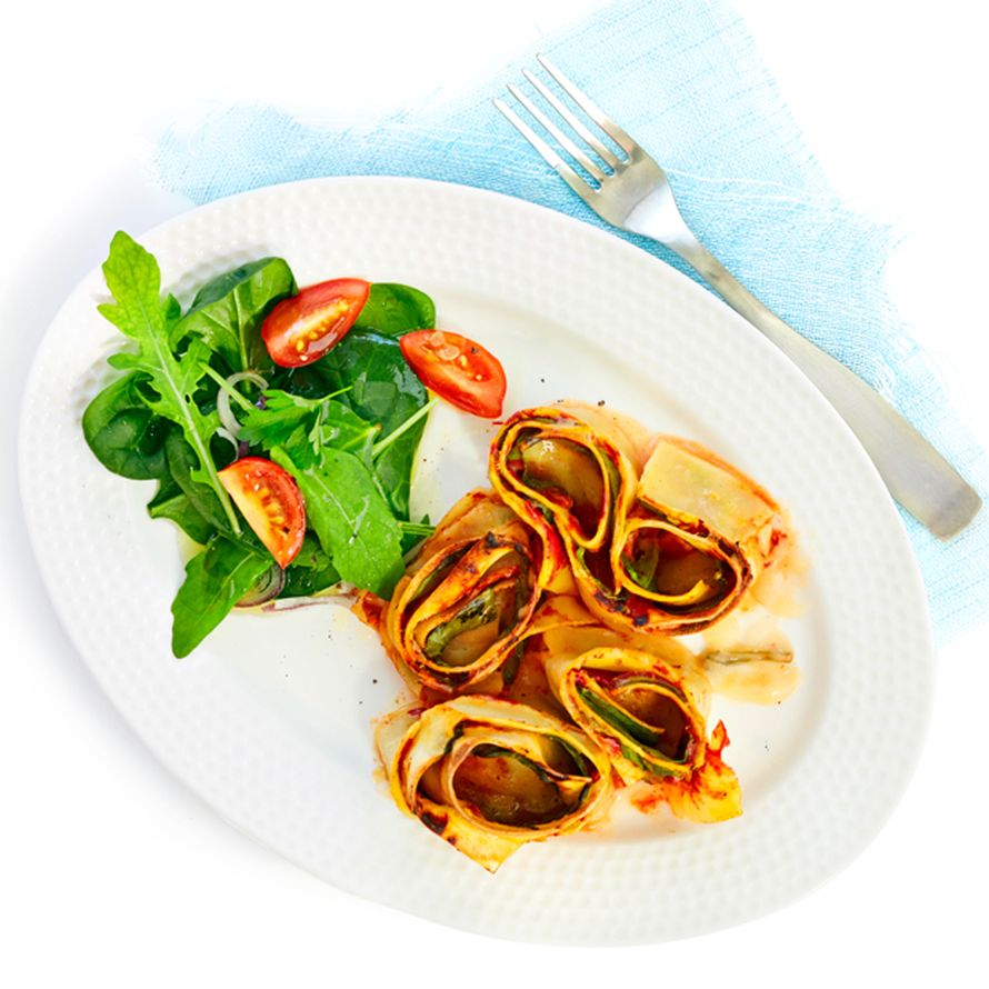 2. Lado pastalevyt työlaudalle ja voitele ne tomaattipyreellä, lisää jokaiselle pinaattia ja mozzarellaa palasina, kääri rullalle ja leikkaa rullat 3–4