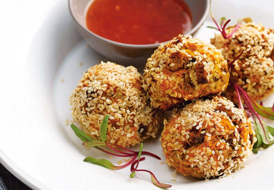 3. Yhdistä kulhossa kaikki porkkana-itupallojen ainekset ja sekoita tasaiseksi. Ota massasta ruokalusikalla nokareita ja pyörittele ne käsin tiiviiksi palloiksi. Kierittele pallot seesaminsiemenissä ja nosta ne leivinpaperilla vuoratulle uunipellille.