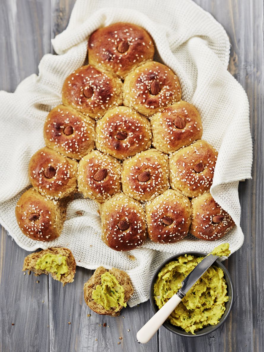 5. Pitkänomaisia leipiä ei tarvitse voidella. Anna niiden kohota hyvin ja paista 200-asteisessa uunissa 40–45 min. Voitele sämpyläkuuset vatkatulla munalla, ripota päälle seesaminsiemeniä ja paina jokaiseen sämpylään manteli. Paista 200-asteisessa uunissa 15 min.