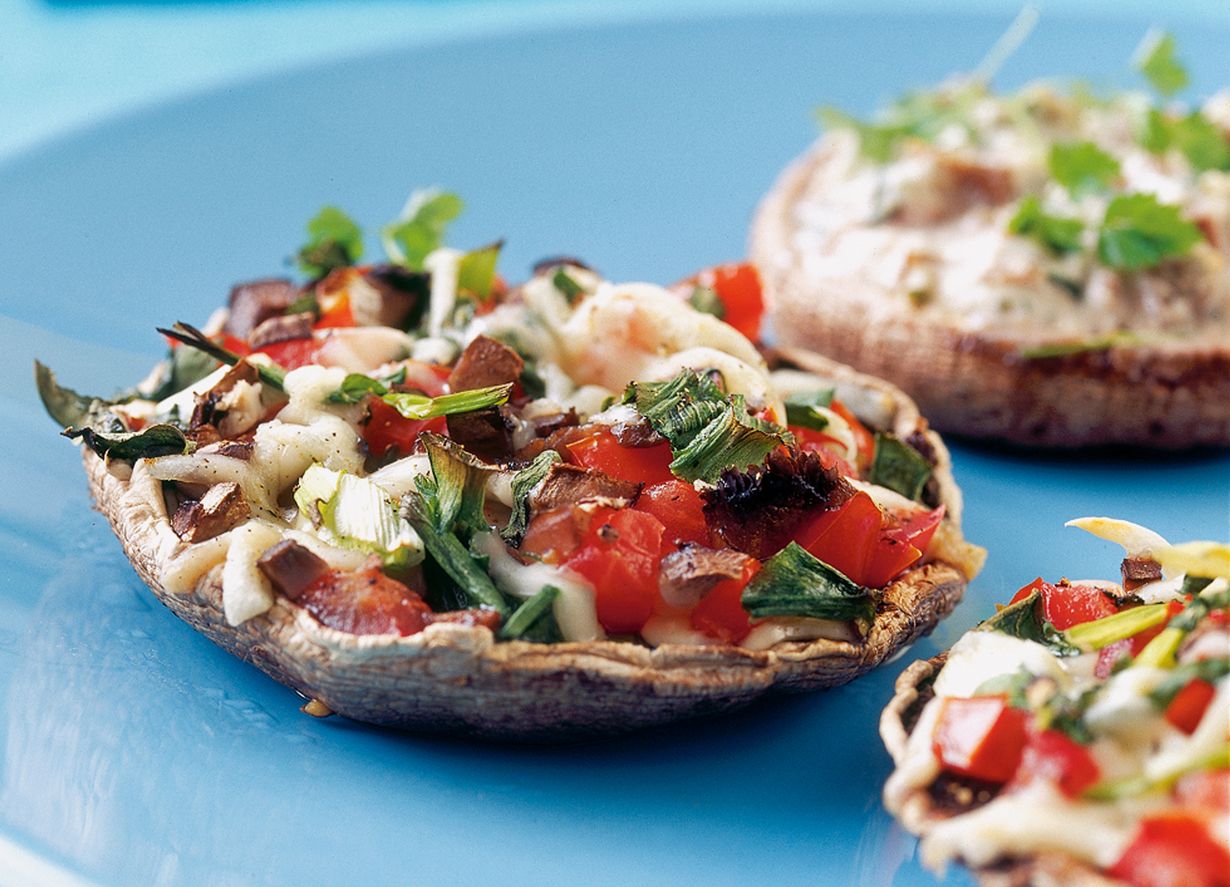 3. Paista täytetyt lakit 225 asteessa uunin keskiosassa 10-15 minuuttia. Tarjoile lämpiminä basilikalla koristeltuina.