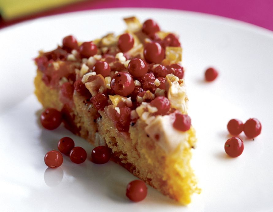 3. Levitä taikina vuokaan ja ripottele pinnalle kardemumma tai kaneli ja sen päälle omenakuutiot, puolukat, sokeri ja pähkinärouhe.