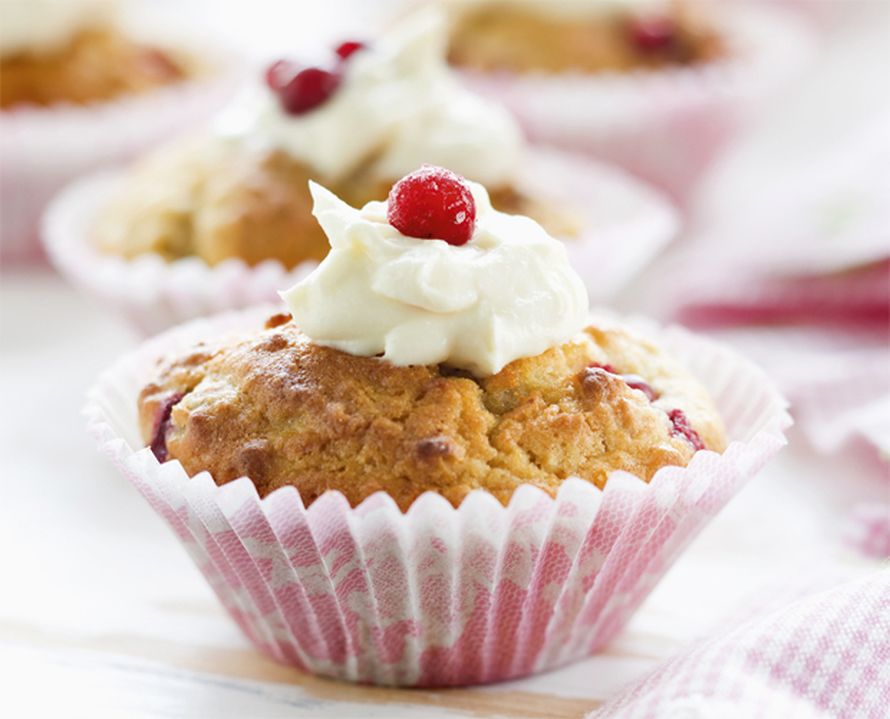 3. Lusikoi taikina muffinivuokiin. Kypsennä 200 asteisen uunin keskitasolla 15–20 minuuttia. Anna jäähtyä ja lusikoi pinnalle nokareet vaniljatuorejuustoa. Koristele puolukoilla.