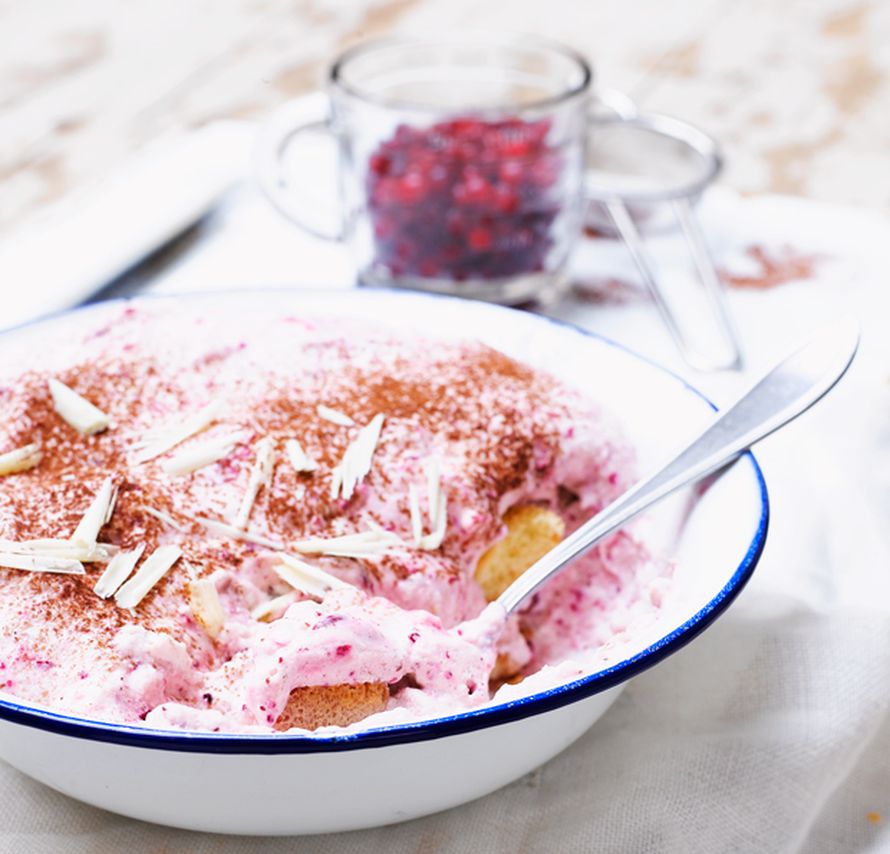 7. Annostele puolet puolukkaseoksesta tiramisukeksien päälle. Kasta loput kekseistä puolukkamehuun ja nosta ne täytteen päälle. Lisää vielä kerros puolukkaseosta. Viimeistele jälkiruoka tummalla kaakaojauheella ja valkosuklaalastuilla.