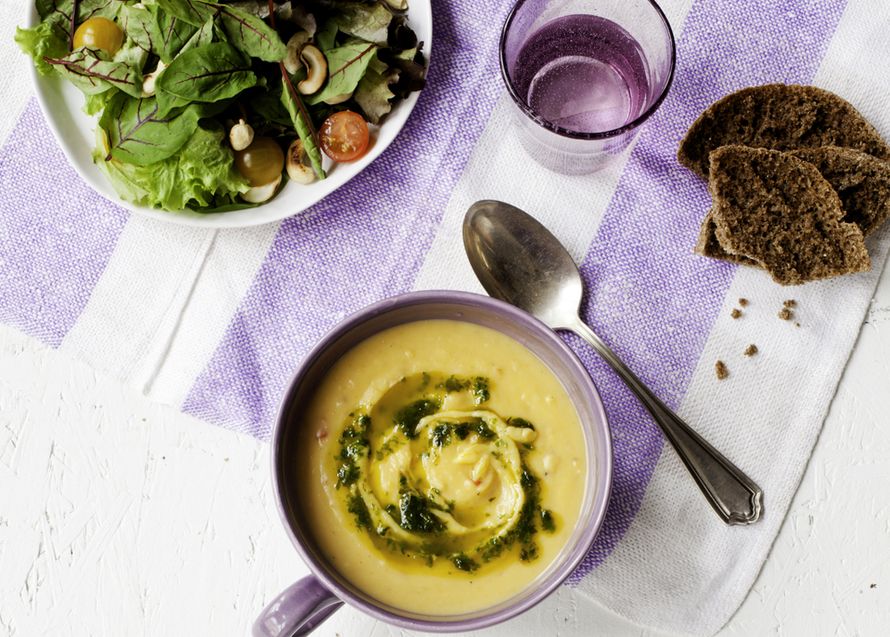 Tarjoa sosekeitto yrttiöljyn kera. Tarjoa runsaan vihersalaatin ja paahdetun täysjyväleivän kanssa.