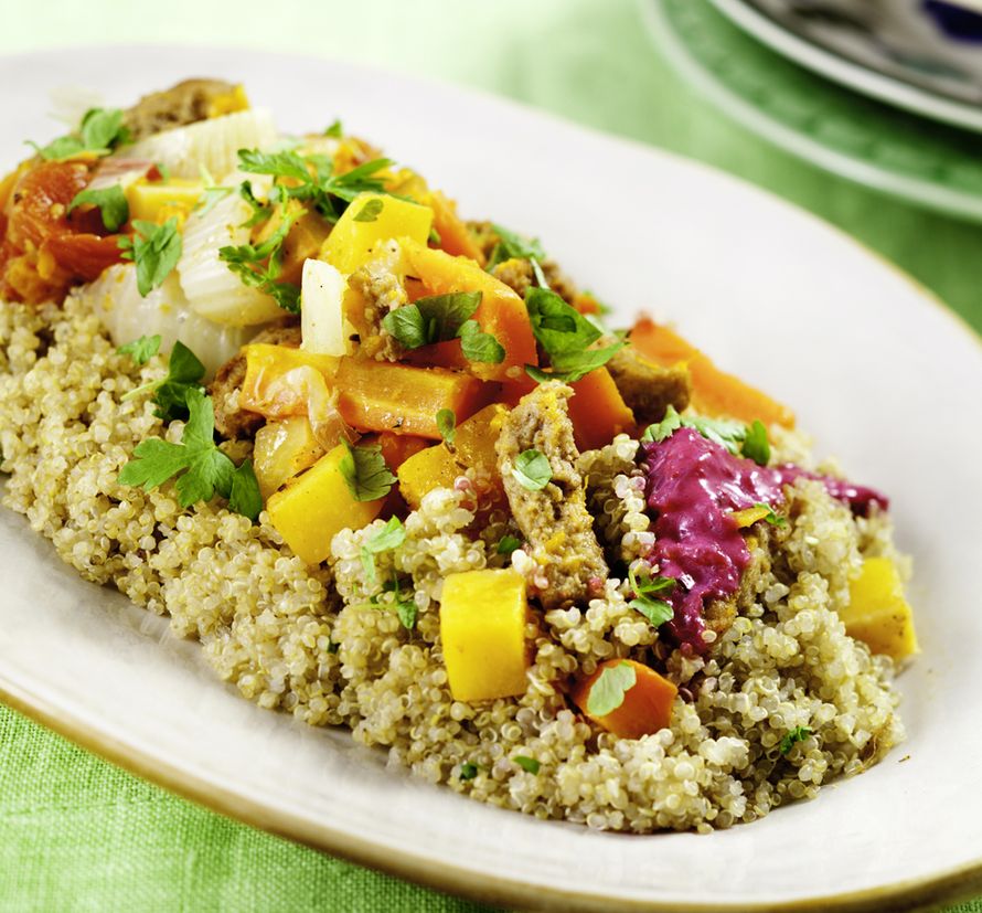 5. Huuhtele kvinoa huolella ja keitä kypsäksi pakkauksen ohjeen mukaan. Mausta suolalla. Kuori ja raasta punajuuret hienoksi. Kuullota mausteet öljyssä, anna jäähtyä hieman. Sekoita punajuuriraasteen ja soijajogurtin kera. Tarjoa keitetyn kvinoan ja soija-kasvishöystön kera.