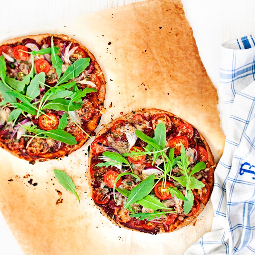 5. Vedä leivinpaperi kuumalle pellille ja paista pitsoja 250 asteessa uunin keskitasolla 12–16 minuuttia, kunnes juusto saa hiukan kullanruskeaa väriä. Ripottele rucolaa pitsalle ja tarjoa heti.
