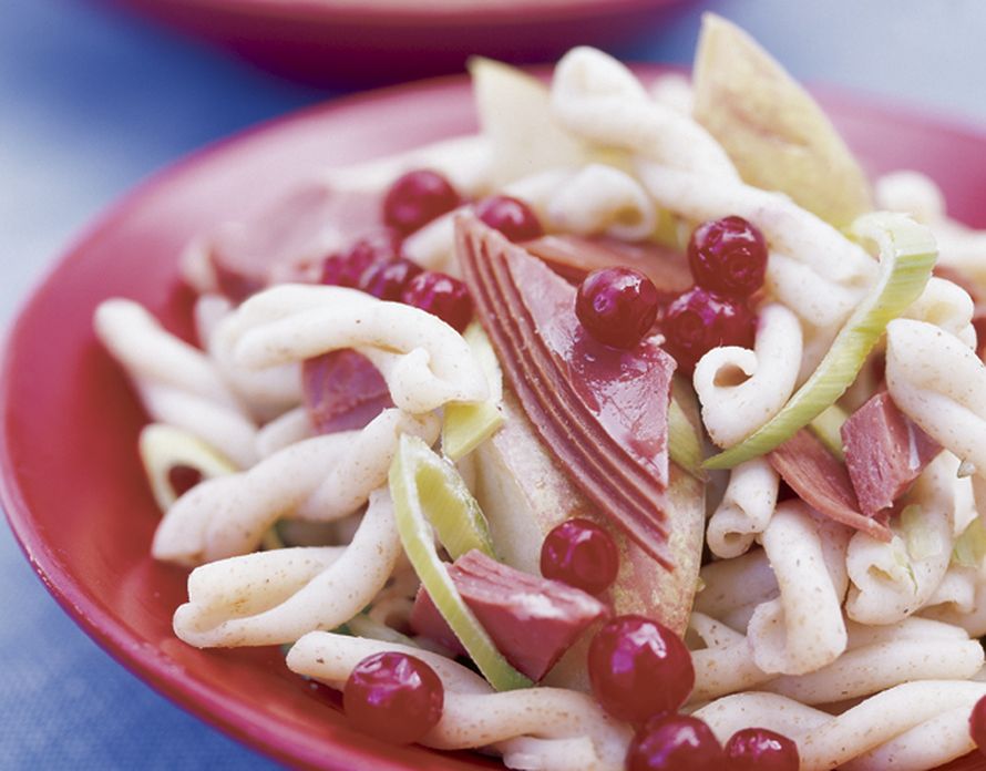 4. Sekoita salaatinainekset jäähtyneen pastan joukkoon ja ripottele pinnalle puolukoita. Viilennä salaatti jääkaapissa.