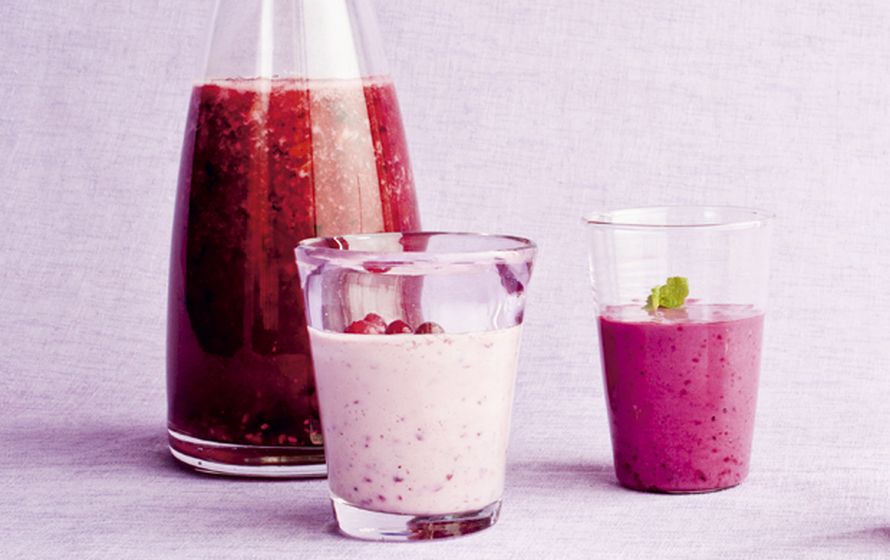 1. Mittaa vadelmat, mustaherukat ja kiven¬näisvesi tehosekoittimen kannuun. Sekoi¬ta tasaiseksi.