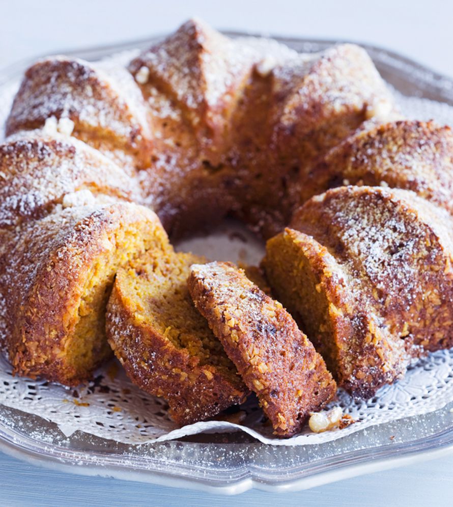 3. Vatkaa valkuaiset kovaksi vaahdoksi ja nostele taikinaan varovasti hämmentäen. Kaada taikina voideltuun rengasvuokaan tai pitkulaiseen leipävuokaan. Paista uunin alatasolla 175 asteessa noin tunnin verran, kunnes kakku on kypsä. Anna kakun jäähtyä ja kumoa se alustalle.