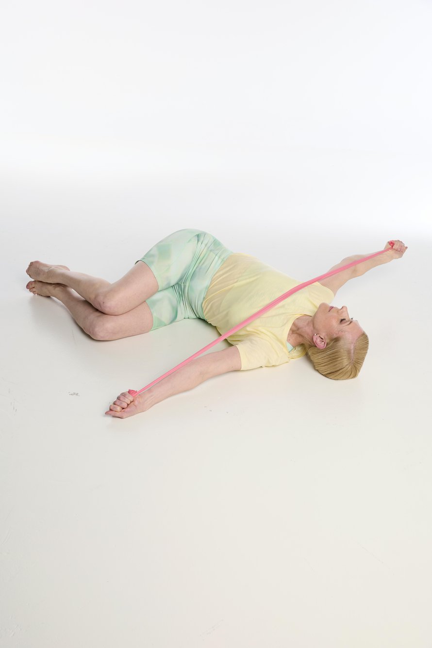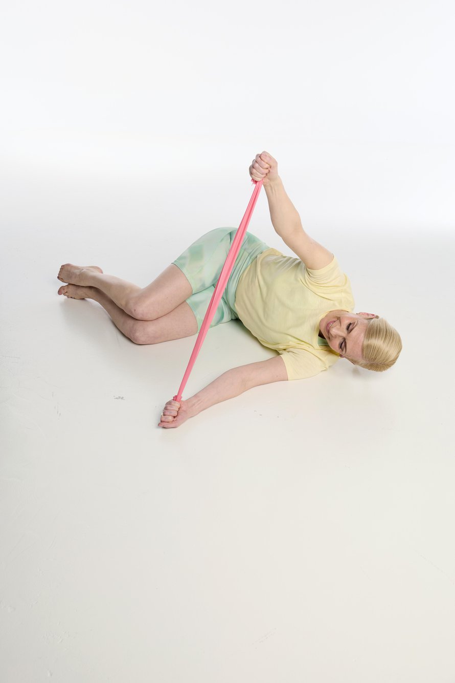 Paina etummainen käsi lattiaan. Kierrä ylävartaloa ja vie käsi peukku edellä taakse lattiaan. Vastuskumin ansiosta liike ohjautuu myös yläselän lihaksille. Lapaluu liukuu kohti selkärankaa, jolloin olkapäällekin löytyy oikea luonnollinen liikerata eikä se jää eteen. Tee liike myös toisella kyljellä maaten.