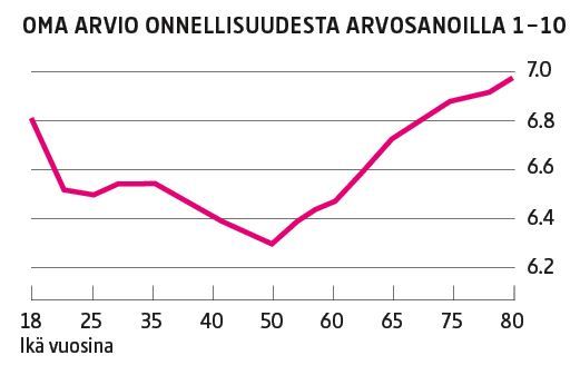 Oma arvio onnellisuudesta on korkealla parikymppisenä ja lähtee siitä laskuun. U:n muotoisen käyrän alamäki sukeltaa syvimmälle 50-vuotiaana, sen jälkeen ihmiset arvioivat henkisen hyvinvointinsa kasvavan vuosi vuodelta.