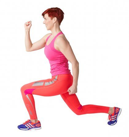 Muista: Pidä polvet ja varpaat samalla linjalla. Tee mahdollisimman syvä askelkyykky ja sieltä tehokas ponnistus, jotta teet sekä reidellä että pakaralla kunnolla töitä.
