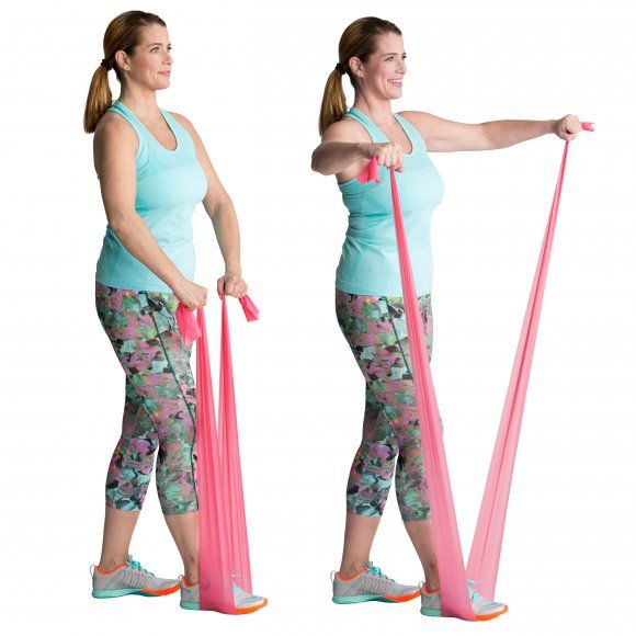 Seiso jalat lantion leveydellä hieman peräkkäin, polvet joustavina. Laita kuminauha etummaisen jalkapohjan alle. Ota kiinni kuminauhasta kädet hieman koukussa ja kyynärpäät ulospäin. Nosta kädet sivulle vaakatasoon, pidä hetken ja laske alas.