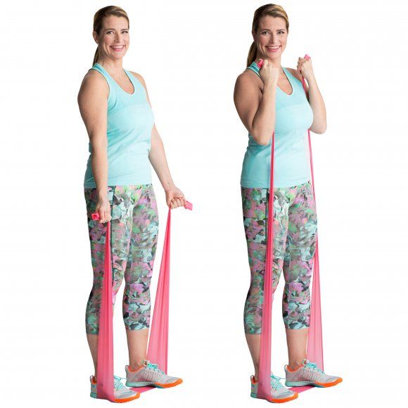 Seiso jalat lantion leveydellä. Laita kuminauha jalkapohjien alle ja ota tiukka ote kuminauhasta. Kädet ovat suorina vartalon sivulla, kämmenet eteenpäin. Koukista kädet niin, että nyrkit melkein koskettavat olkapäitä. Laske kädet rauhallisesti takaisin ojennukseen.