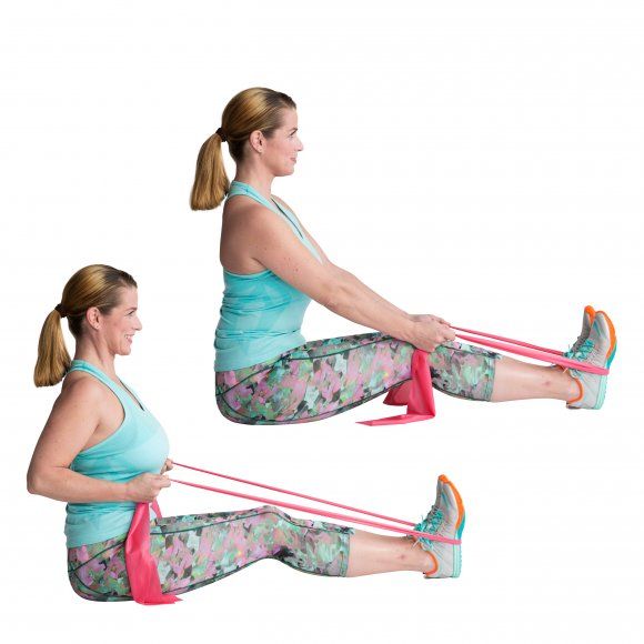 Istu jalat hieman koukussa. Laita kuminauha jalkapohjien taakse. Kädet ovat suorina edessä, ote kuminauhasta. Vedä kyynärpäät taakse, lavat yhteen ja rinta ulos. Pidä hetken ja päästä rauhallisesti takaisin.