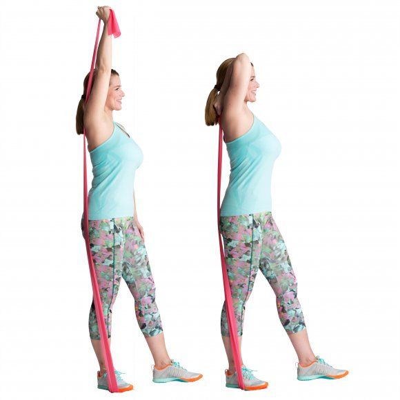 Seiso jalat lantion leveydellä hieman peräkkäin, polvet joustavina. Laita kuminauha oikean jalkapohjan alle ja ota kiinni kuminauhasta oikealla kädellä. Nosta oikea käsi suoraksi ylös. Anna käden koukistua alas kohti niskaa. Tee sama vasemmalla kädellä, vasen jalka takana.