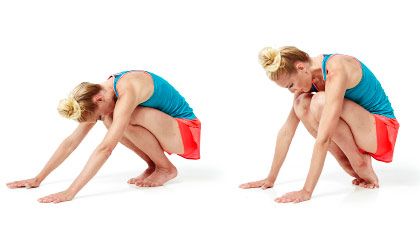 (A) Nouse takaisin kyykkyyn, hengitä ulos ja suorista jalat. Pidä ylävartalo alhaalla. Seuraavalla uloshengityksellä vedä vatsa sisään ja ylös sekä mieti kolikkoa pakaroiden välissä.