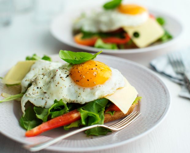 2. Nosta leivälle reippaasti kasviksia, juusto- ja kalkkunaviipaleet ja lopuksi paistettu aurinkoinen kananmuna. Ripsauta päälle kevyesti suolaa ja mustapippuria.
