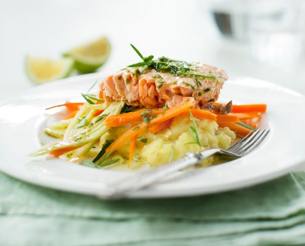 4. Suikaloi fenkoli ja porkkanat ja höyrytä tai wokkaa suikaleet napakan rouskuviksi. Tarjoile lohi peruna-omenamuusin, kasvisten ja lopun rosmariini-limettiöljyn kera.