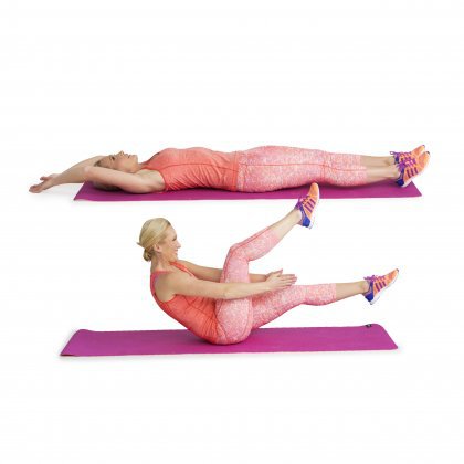 Makaa selinmakuulla, kädet ovat suorina pään yläpuolella. Uloshengityksellä nouse istumaan vatsalihaksia käyttäen ja vedä oikea polvi rintaan ja taputa kädet yhteen polven alla. Laskeudu hallitusti alas sisäänhengityksellä. Nouse uudelleen ja vedä vasen polvi ylös ja taputa polven alla. Toista molemmilla jaloilla 10-15 kertaa.