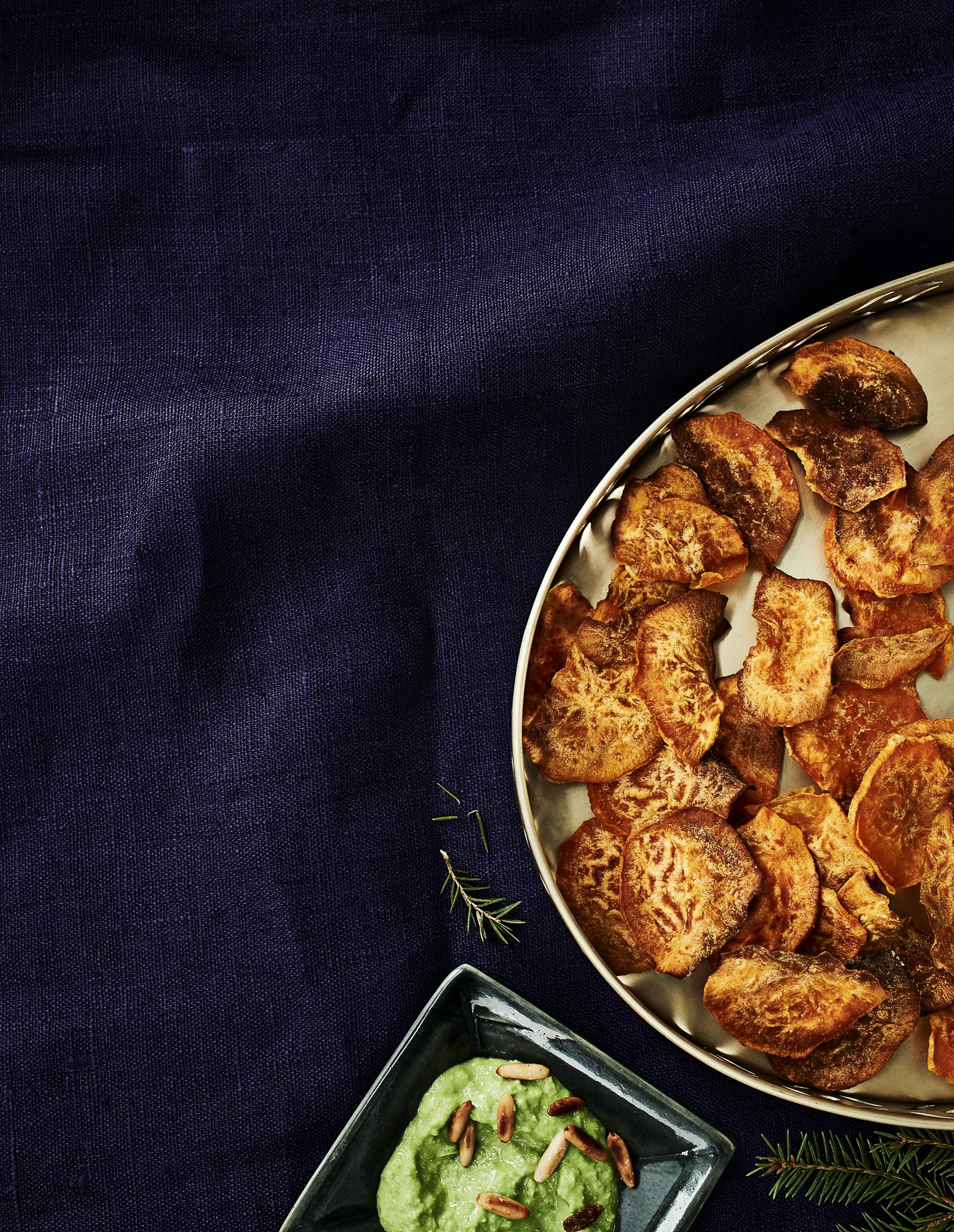 Helppo alkupala valmistuu rapeista bataattilastuista, joita dippaillaan raikkaaseen jogurttikastikkeeseen.