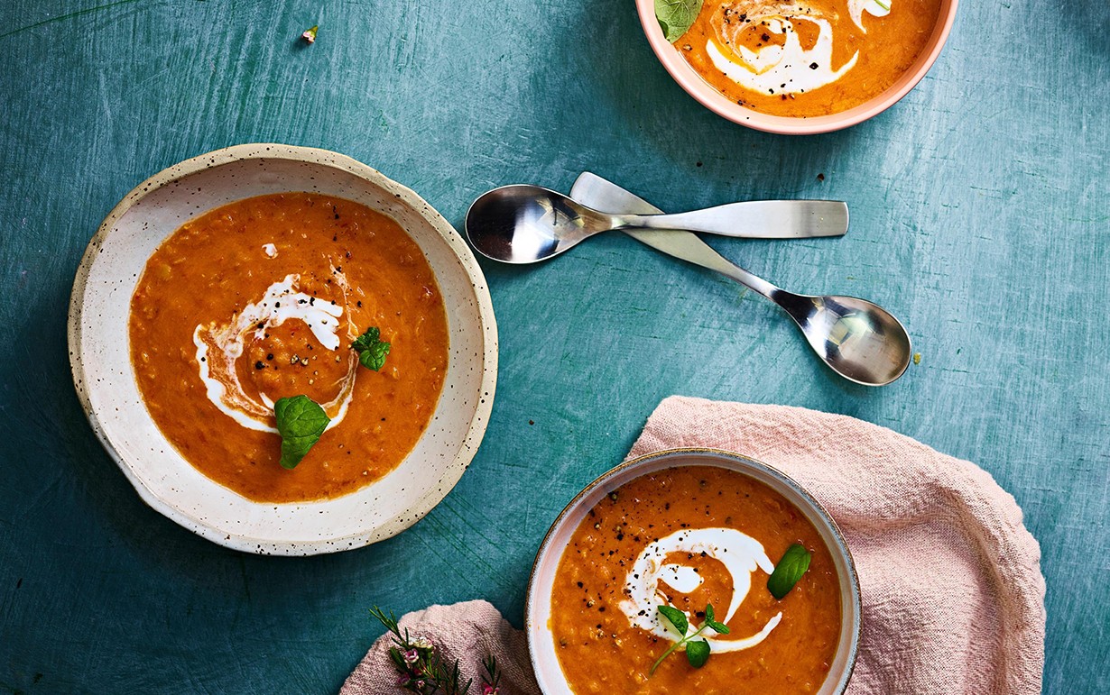 Tuoreella inkiväärillä maustettu, kookosmaitoon tehty linssi-tomaattikeitto lämmittää pakkaspäivänä.
