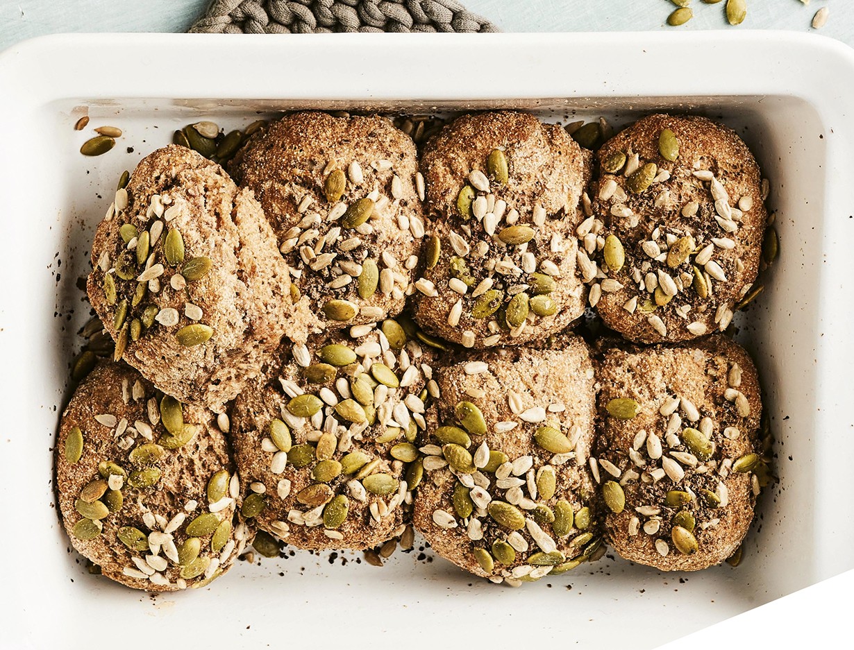 Soodasämpylöitä ei tarvitse vaivata eikä kohottaa. Saat niistä myös hyvän määrän proteiinia, siitä pitävät huolen piimä- tai jogurttipohjainen taikina ja kolmenlaiset siemenet.