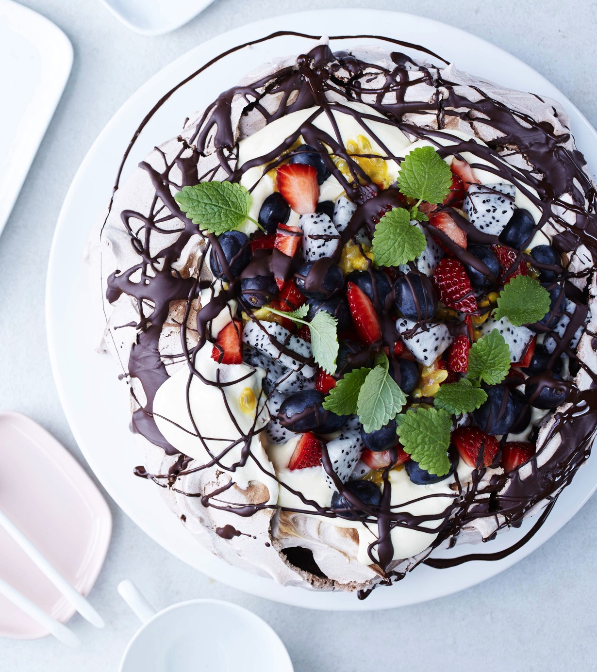 Kevyt ja ihanan raikas pavlova tarjoillaan marjojen ja gluteenittoman kauravaniljavaahdon kera.