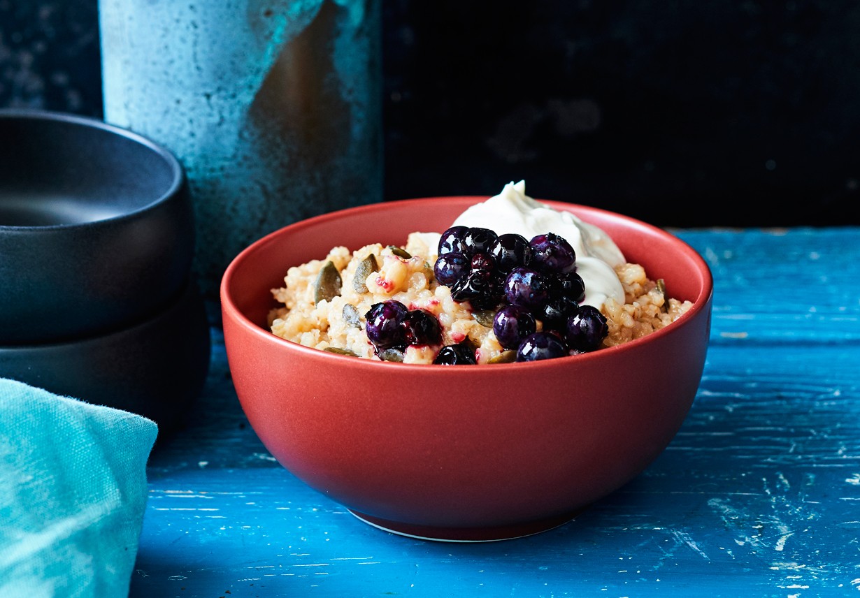 - Murskaa mustaherukat, mustikat ja ruokosokeri kulhossa haarukalla tai puunuijalla. Tarjoile puuron kanssa pikaherukkahilloa ja vaniljarahkaa.