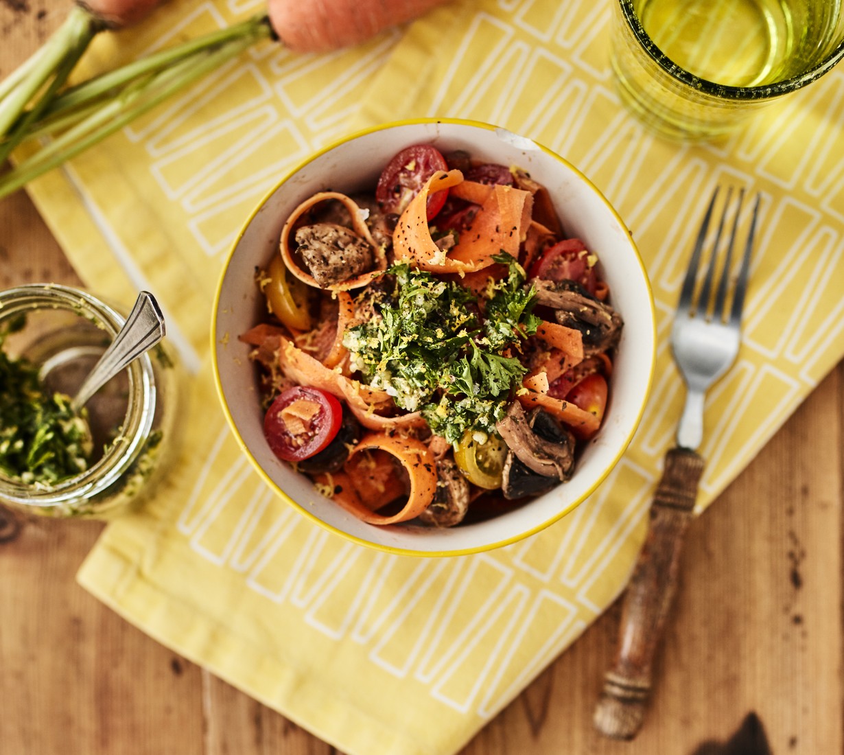 Kuori porkkanat ja höylää niistä perunankuorimaveitsellä ”tuorepastaa”. Puhdista ja paloittele herkkusienet.