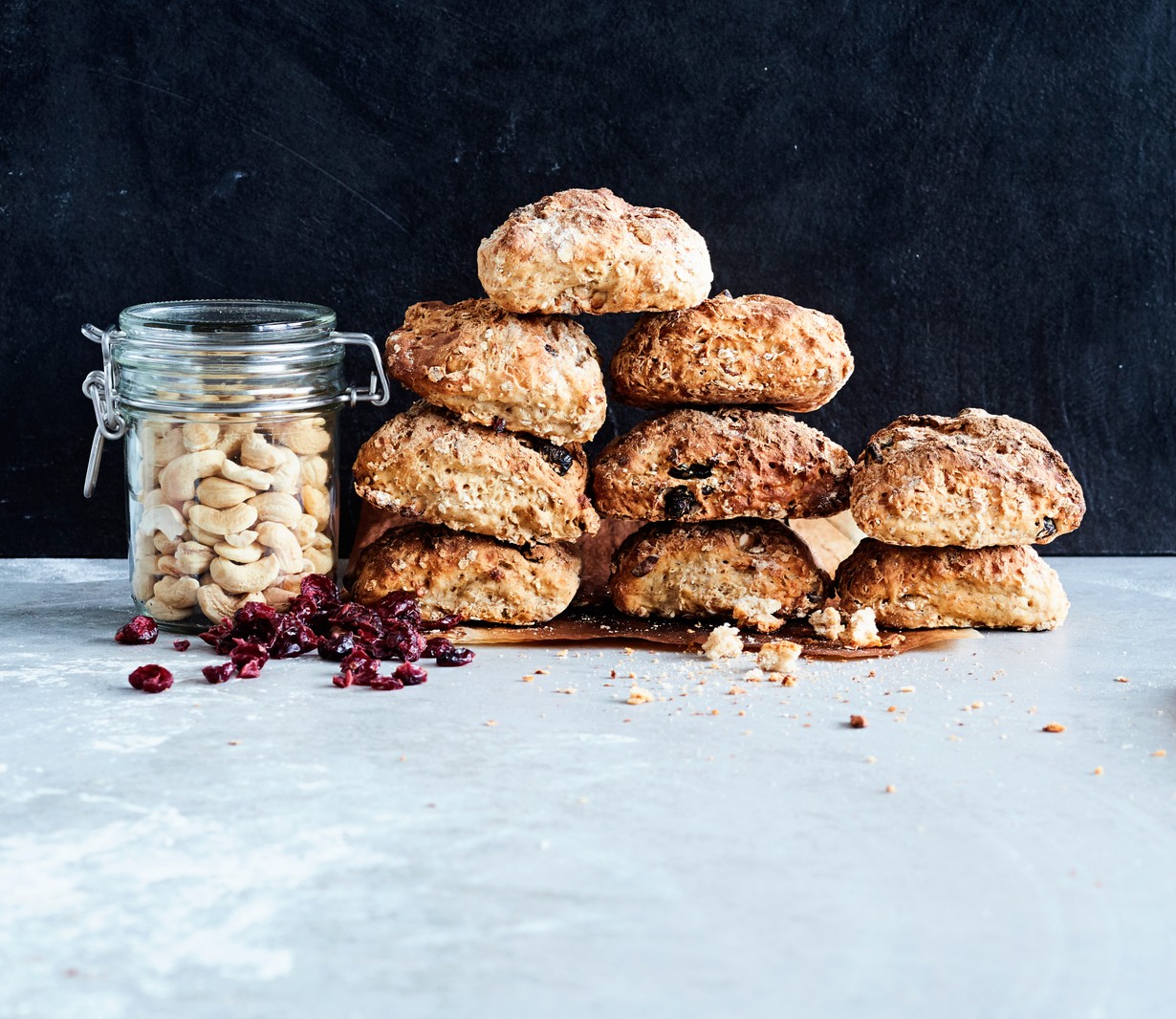 Muhkeat, makua täynnä olevat sämpylät ovat pienen vaivan väärti. Murskatut hapankorput antavat kivaa hapahkoa makua, ja kuivatut karpalot ja cashewpähkinät purutuntumaa.