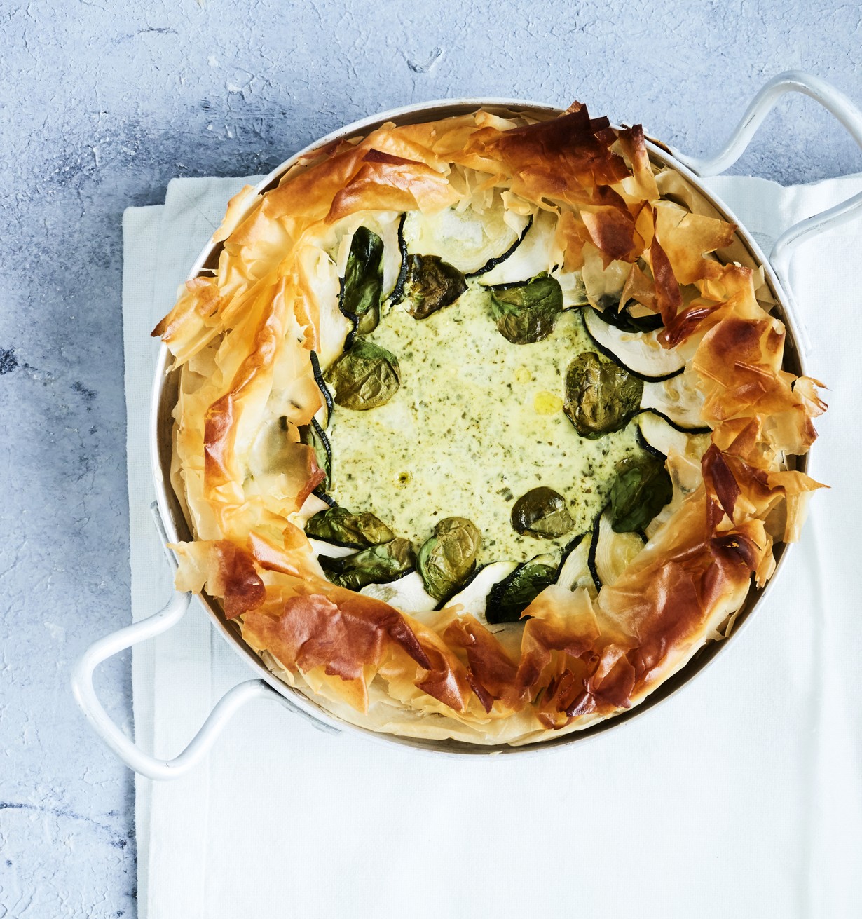 - Leikkaa filoarkit kahteen osaan. Laita kaksi arkkia noin 30-senttisen vuoan pohjalle ja reunoille. Sivele päällimmäisen arkin pinta kevyesti oliiviöljyllä. Jatka kunnes olet laittanut kaikki arkit vuokaan.